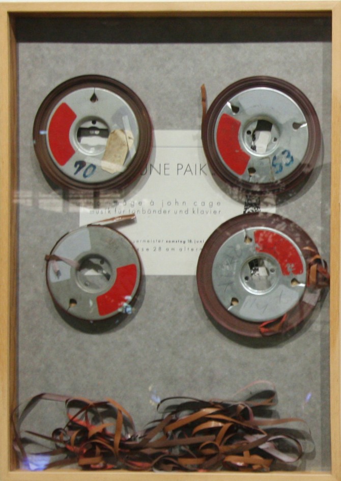 백남준의 존 케이지에 대한 경의 는 사각형의 액자 안에 4개의 릴테이프가 고정되어 있는 형태의 작품이며 액자 안에는 릴 테잎부터 빠져나와 보이는 테잎들이 엉켜 쌓여있는 모습이 인상적인 작품이다. 작곡가는 이러한 형태에서 액자에 갇혀있는 4개의 현악기, 즉 공간에 갇혀있는 현악사중주의 이미지를 지속적으로 연상하게 되었다. 연주되는 동안 불명료하고 거친 질감을 가진 소리객체들은 미술관 공간 안에서 끊임없이 설치된 소리를 넘어 움직이는 소리를 만들어간다.