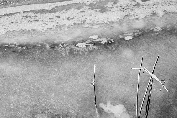 Un étang et des formes surprenantes nées de phénomènes mystérieux, au loin des oiseaux qui semblent aussi sans mouvement, abstraits, alors qu’ils ne font qu’une brève halte avant de poursuivre leurs pérégrinations.