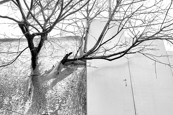 Un arbre s'échappant d’une palissade de fortune, camouflant un chantier - un bâtiment est détruit pour faire place à une nouvelle construction mais cet arbre devrait survivre. En attendant il semble sortir d’un rideau de théâtre, je crois qu’il a beaucoup de choses à nous dire!