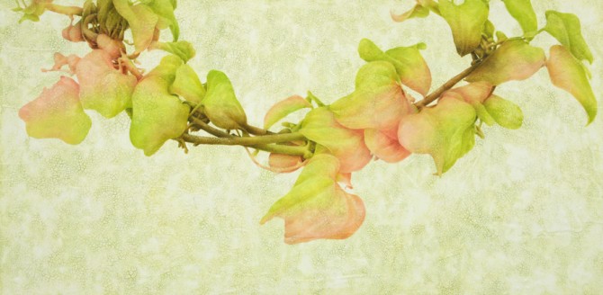 홍주혜의 작품 ‘Vine'에서 오랜 세월의 흔적으로 미세하게 갈라진 크랙(crack)의 바탕에 놓여있는 넝쿨에는 새순이 돋고 싱싱한 잎 사이에 벌레 먹은 이파리도 보인다. 그러면서도 살아있는 넝쿨이라기보다 시간을 초월한 관념적인 이미지로 느껴진다. 작품에서 비트나 역동성을 찾을 수 없다. ‘누군가에 의해 만들어지지 않은 것’과 같이 무중력의 공간 안에 떠있다.