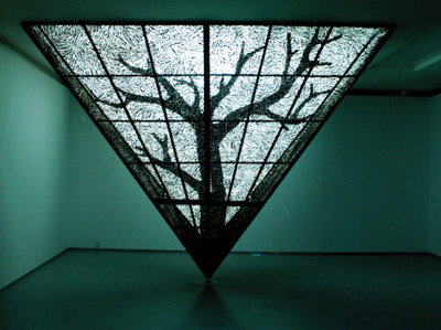 그 속에서 산맥이 굽이치고 평야와 구릉 사이로 강이 흐르고 있다. 우주 공간의 한 단면을 필름과 같은 막으로 떼어놓으면 이런 형국으로 나타날까? 뚫린 구멍 사이로 쏟아지는 빛이 만들어내는 환상 못지않게 이 표면은 중요하다. 그것은 작가가 중성적이며 비인격적인 철판과 대결하며 만들어낸 노동의 결과이자 그것을 통해 표현하고자 한 개념과 의도가 살아 꿈틀대는 증거이기 때문이다.